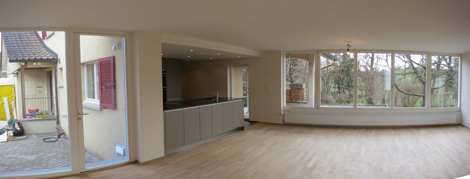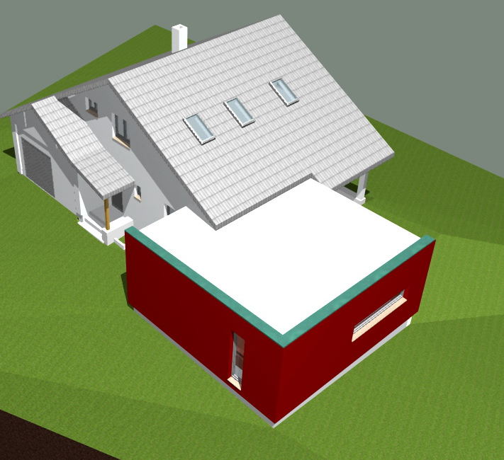 Es wurde nun ergänzt durch einen grossen Wohnraum in Winkelform, der in den bestehenden Obstgarten gestellt wurde. Die Wand gegenüber den Nachbarn wurde mit Sichtschlitzen durchbrochen.