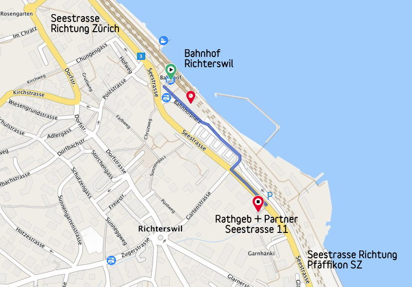 Mit den öffentlichen Verkehrsmitteln erreichen Sie uns zu Fuss vom Bahnhof Richterswil in 3 Minuten.