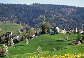 Der «Bären» ist das markanteste Gebäude in Hütten mit Blick auf den Hüttnersee und den Zürichsee.
