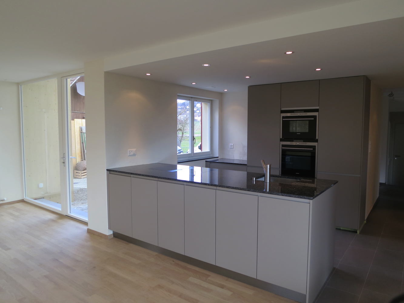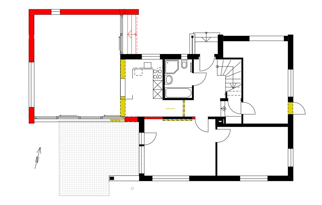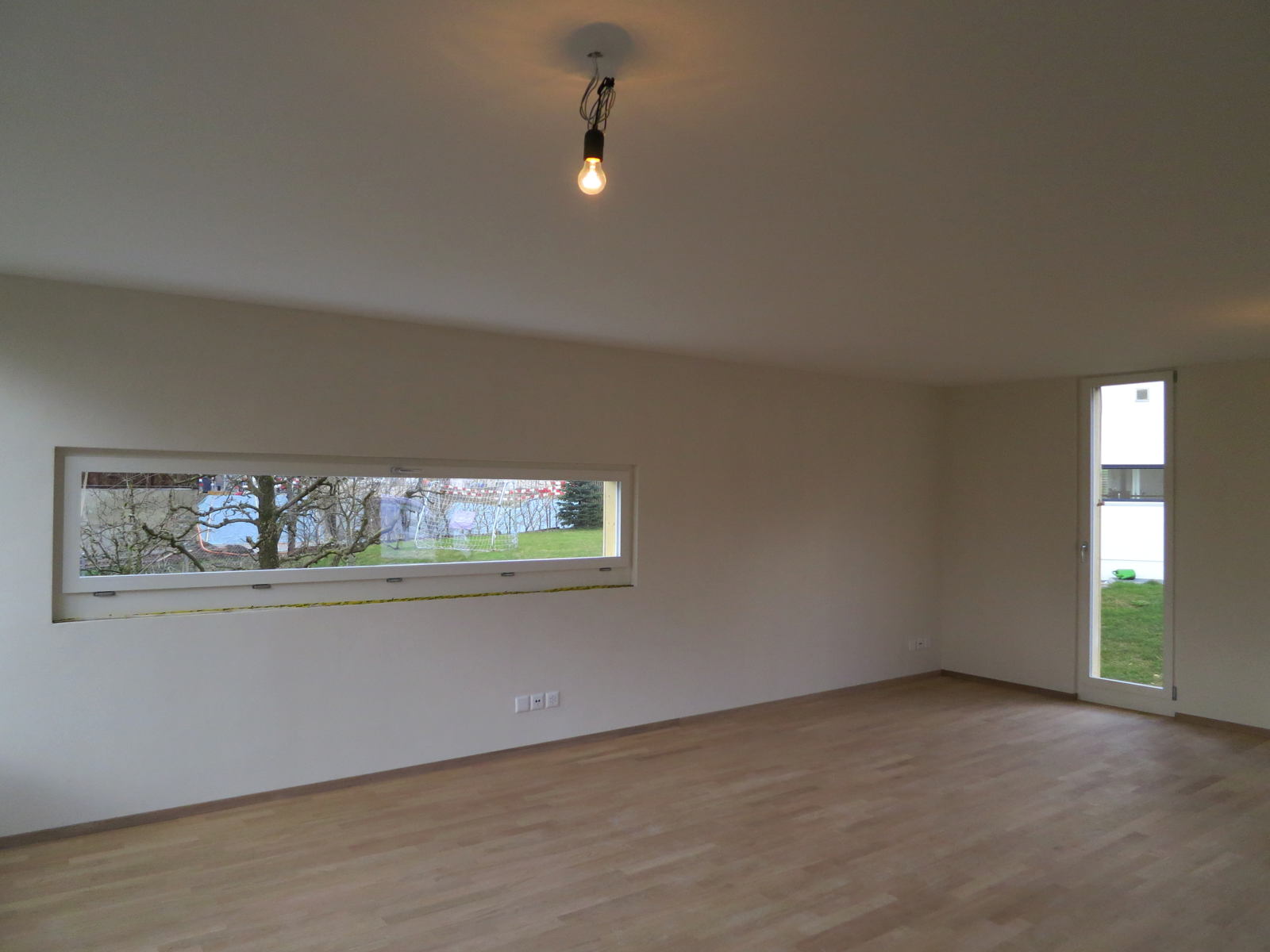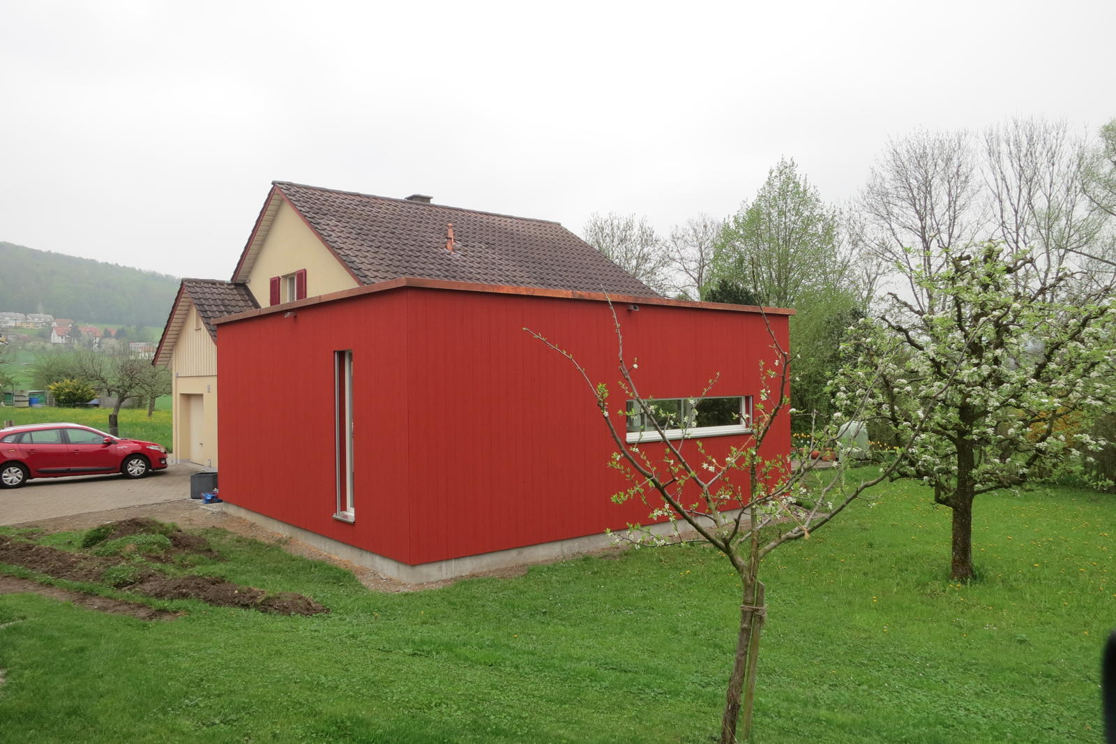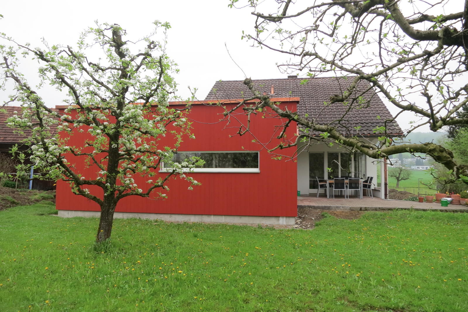 Es wurde nun ergänzt durch einen grossen Wohnraum in Winkelform, der in den bestehenden Obstgarten gestellt wurde. Die Wand gegenüber den Nachbarn wurde mit Sichtschlitzen durchbrochen.