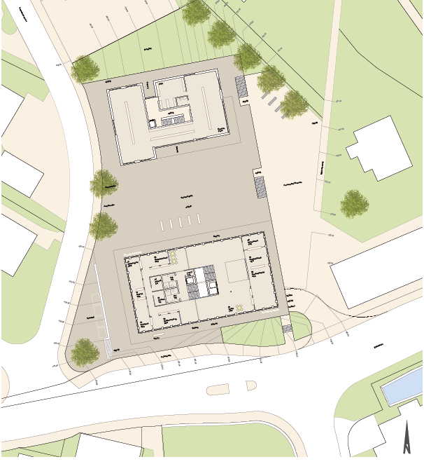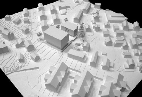 Im Projekt wird bewusst eine funktionale Trennung von Wohnen und Arbeiten angestrebt. Es entstehen zwei Hauptvolumen, welche von einem Sockelgeschoss getragen und verbunden werden. Der neue Gemeindeplatz ist auf den alten Dorfkern orientiert und bietet Durchblicke auf den See.